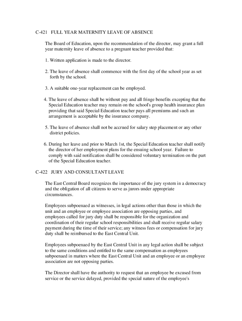 C421 FULL YEAR MATERNITY LEAVE OF ABSENCE The Board of Education, upon the recommendation of the director, may grant a full year maternity leave of absence to a pregnant teacher provided that: 1.