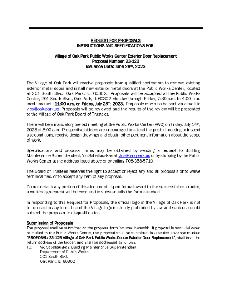 REQUEST FOR PROPOSALS INSTRUCTIONS AND SPECIFICATIONS FOR: Village of Oak Park Public Works Center Exterior Door Replacement Proposal Number: 23123 Issuance Date: June 28th, 2023 The Village of Oak