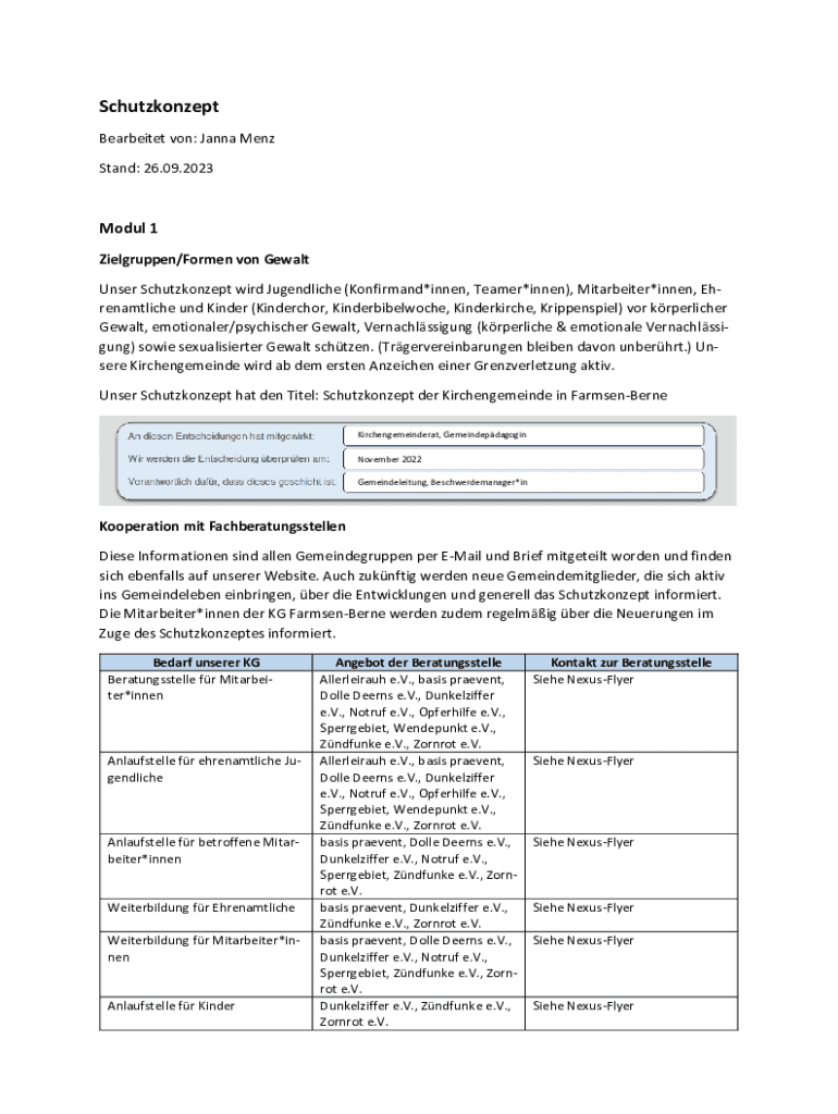 Schutzkonzept Bearbeitet von: Janna Menz Stand: 26.09.2023Modul 1 Zielgruppen/Formen von Gewalt Unser Schutzkonzept wird Jugendliche (Konfirmand*innen, Teamer*innen), Mitarbeiter*innen, Ehrenamtliche