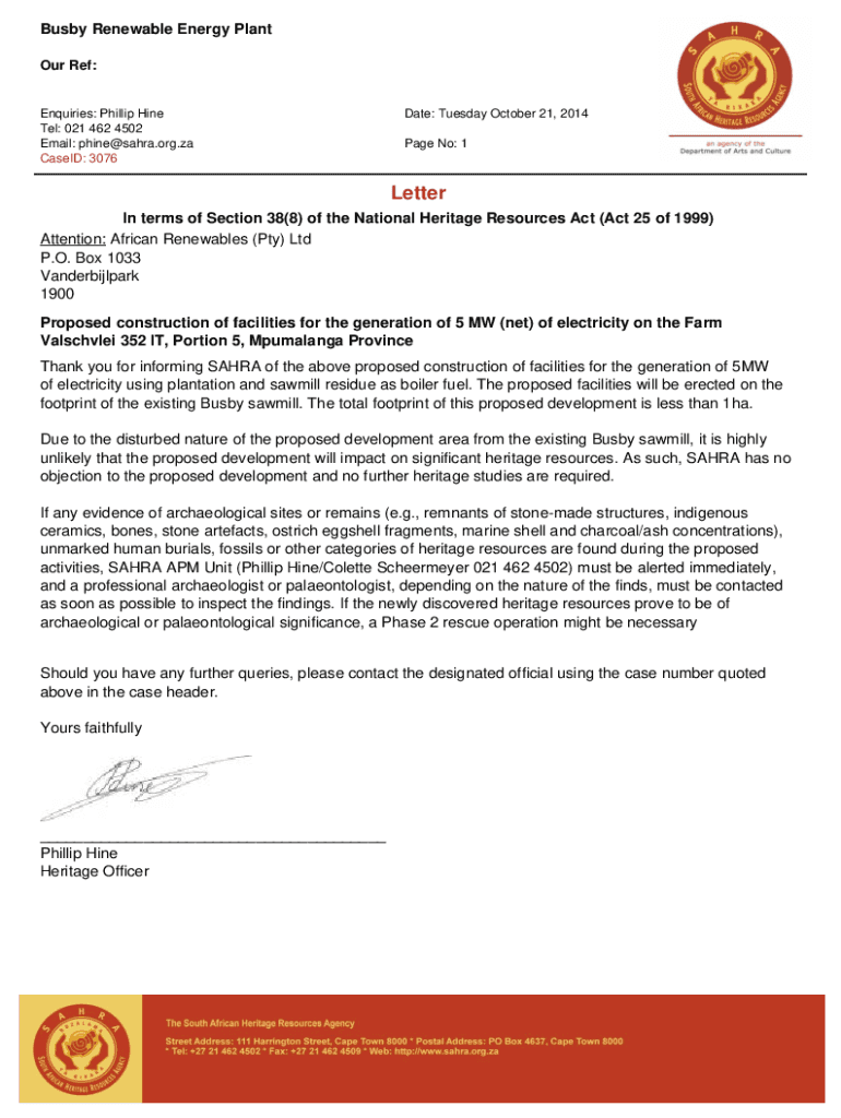 Busby Renewable Energy Plant Our Ref:Enquiries: Phillip Hine Tel: 021 462 4502 Email: phine@sahra.org.za CaseID: 3076Date: Tuesday October 21, 2014 Page No: 1Letter In terms of Section 38(8) of the