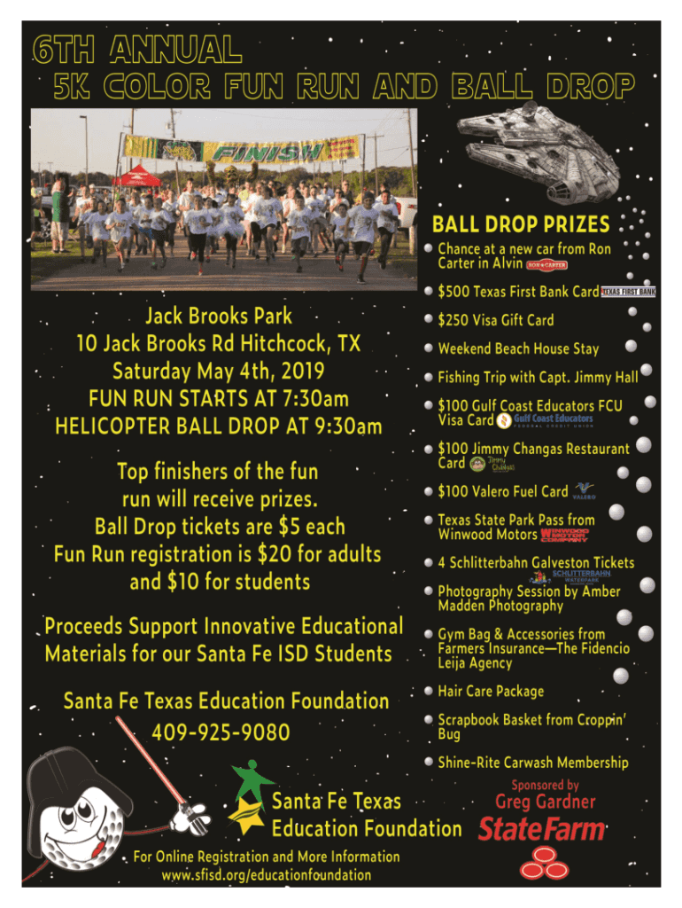 Register for the Color Fun Run & Helicopter Ball Drop Proceeds Become Grants to SFISD Classrooms! You do not need to be present to win the ball drop prizes. You can also register and pay online at