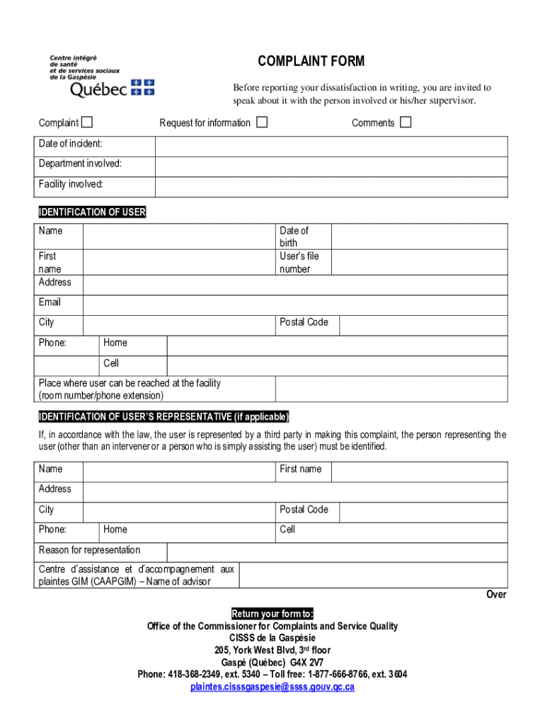 COMPLAINT FORM Before reporting your dissatisfaction in writing, you are invited to speak about it with the person involved or his/her supervisor.ComplaintRequest for informationCommentsDate of incident: