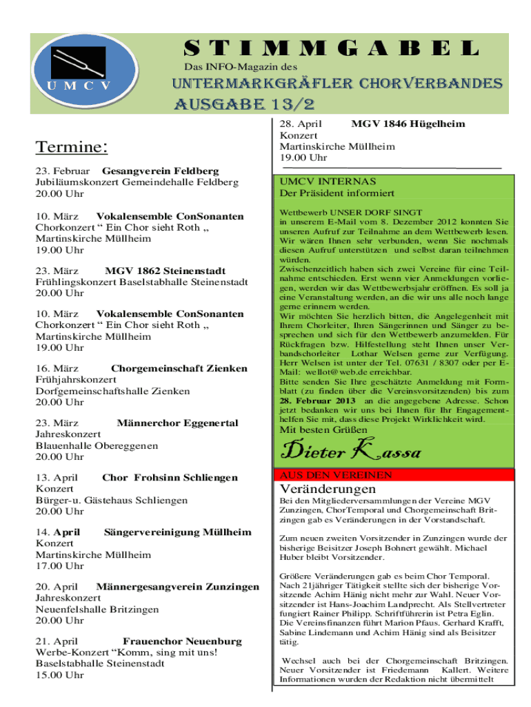 STIMMGABEL Das INFOMagazin desU M C VUM VCUNTERMARKGRFLER CHORVERBANDESAusgabe 13/2Termine: 23. Februar Gesangverein Feldberg Jubilumskonzert Gemeindehalle Feldberg 20.00 Uhr 10. Mrz Vokalensemble
