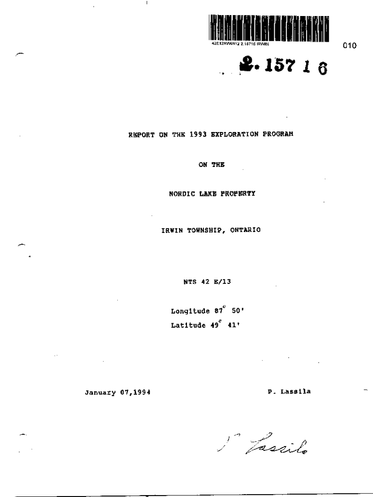 42E12NW0112 2.15716 IRWIN157 l QREPORT ON THE 1993 EXPLORATION PROGRAMON THENORDIC LAKE PROPERTYIRWIN TOWNSHIP, ONTARIONTS 42 E/13Longitude 8?\" 50* Latitude 49C 41\'January 07,1994P. Lassila01042E12NW0112