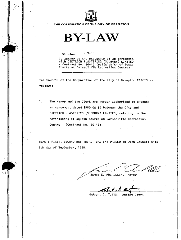 THE CORPORATION OF THE CITY OF BRAMPTONBYLAW Number ___2_39__8_0___To authorize the execution of an agreement with DIETRICH PLASTERING (SUDBURY) LIMITED Contract No. 8045 (refinishing 6f Squash Courts