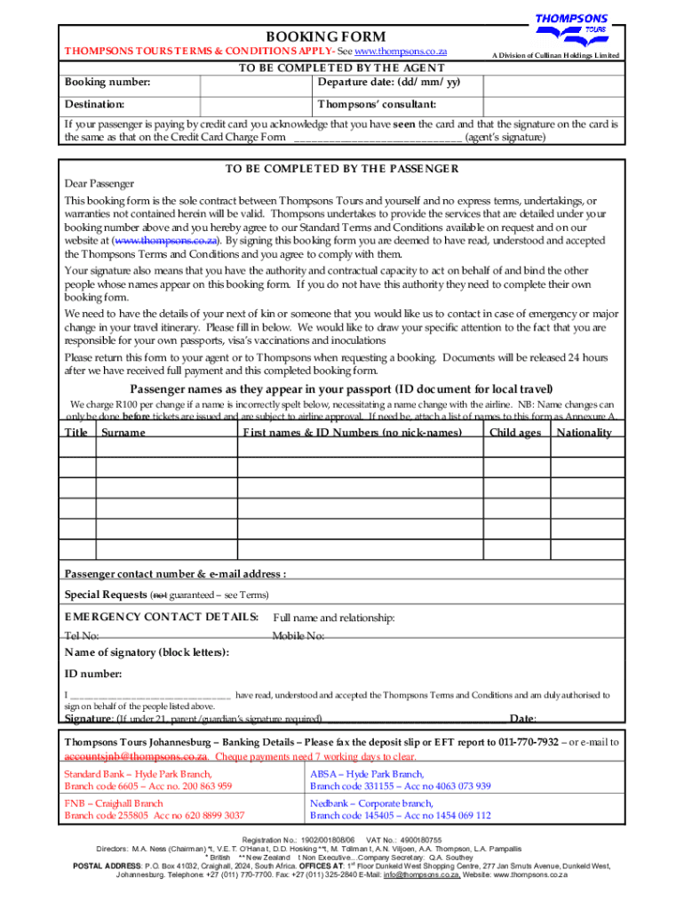 THOMPSON TOURS TERMS & CONDITIONS APPLY See www.thompsons.co.zaBooking number:A Division of Sullivan Holdings Limited TO BE COMPLETED BY THE AGENT