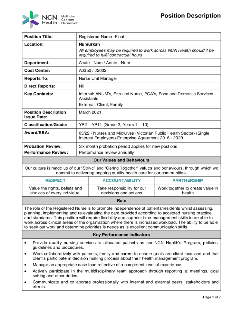 Position DescriptionPosition Title:Registered Nurse FloatLocation:Numurkah All employees may be required to work across NCN Health should it be required to fulfil contractual hoursDepartment:Acute