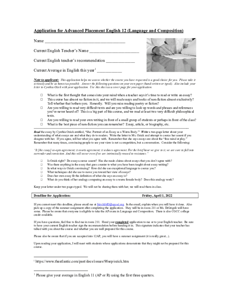 To fill out the AP English teacher recommendation, the teacher should provide detailed assessments of the student’s abilities, including areas of strength, improvement, and readiness for AP coursework.