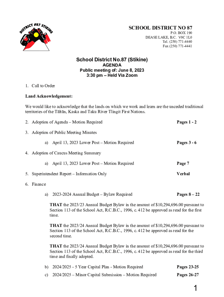 SCHOOL DISTRICT NO 87P.O. BOX 190 DEASE LAKE, B.C. V0C 1L0 Tel. (250) 7714440 Fax (250) 7714441School District No.87 (Stikine) AGENDA Public meeting of: June 8, 2023 3:30 pm Held Via Zoom1. Call to