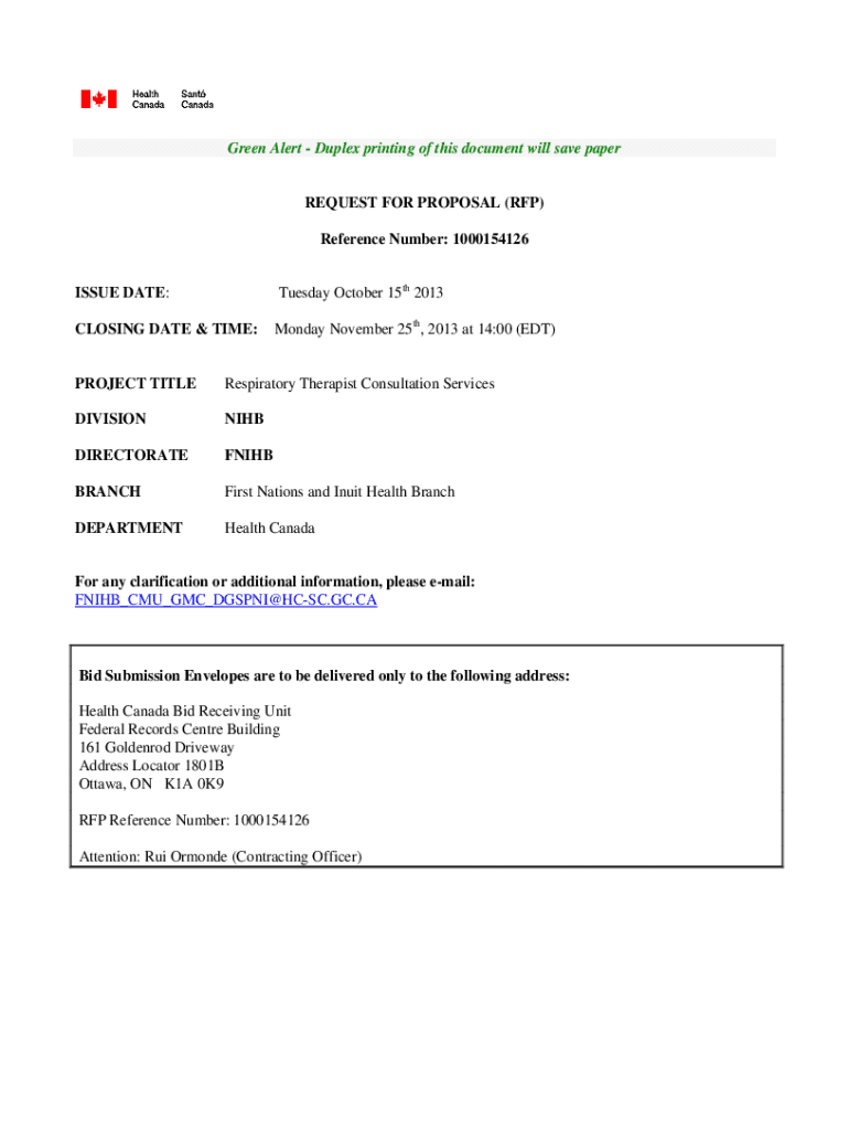 Green Alert Duplex printing of this document will save paperREQUEST FOR PROPOSAL (RFP) Reference Number: 1000154126ISSUE DATE:Tuesday October 15th 2013CLOSING DATE & TIME:Monday November 25th, 2013