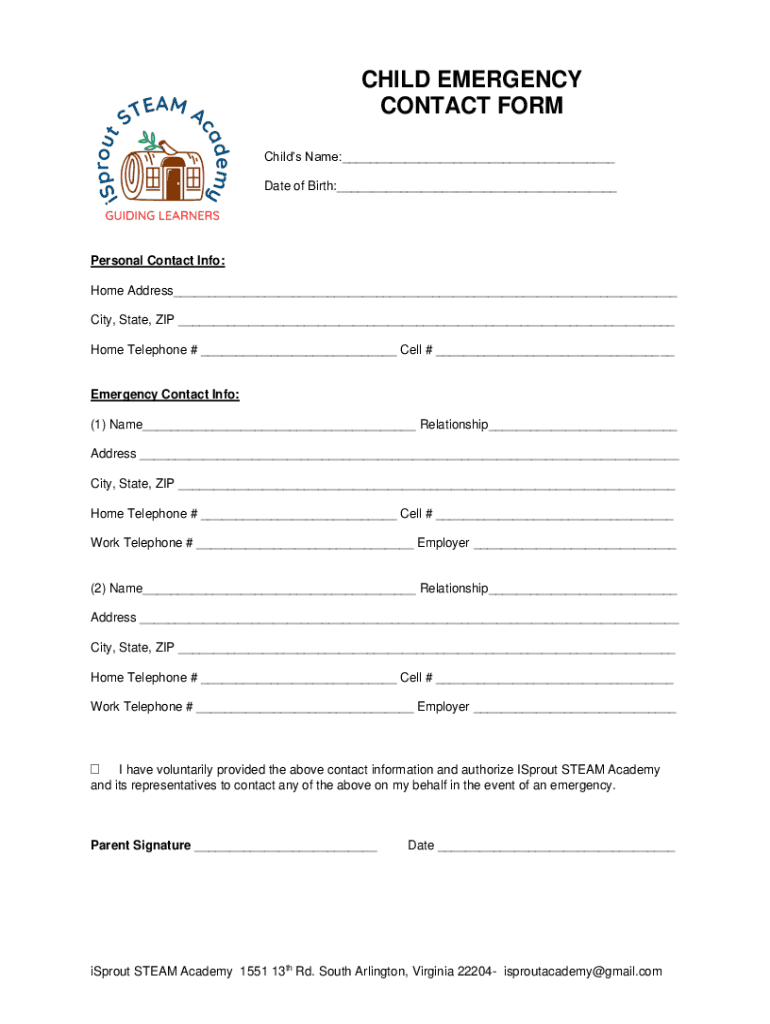 CHILD EMERGENCY CONTACT FORM Childs Name:___ Date of Birth:___Personal Contact Info: Home Address___ City, State, ZIP ___ Home Telephone # ___ Cell # ___Emergency Contact Info: (1) Name___ Relationship___