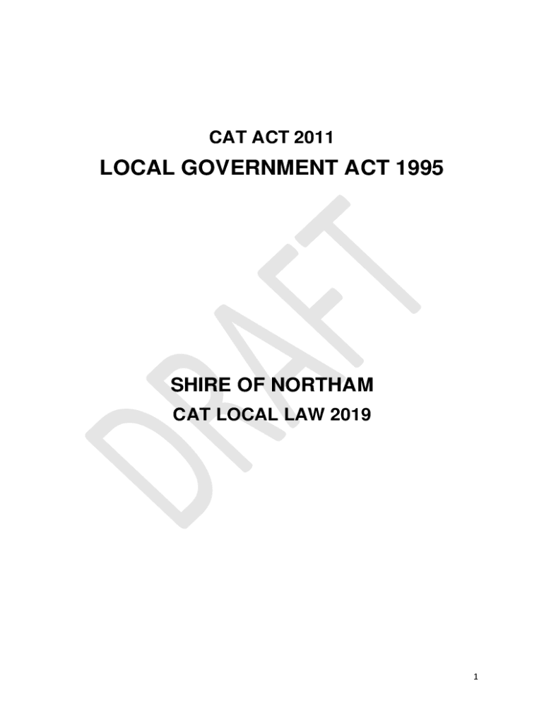 CAT ACT 2011LOCAL GOVERNMENT ACT 1995SHIRE OF NORTHAM CAT LOCAL LAW 20191Cat Act 2011 Local Government Act 1995 SHIRE OF NORTHAMCAT LOCAL LAW 2019 ___Contents ___PART 1 PRELIMINARY 1.1 Title 1.2 Purpose