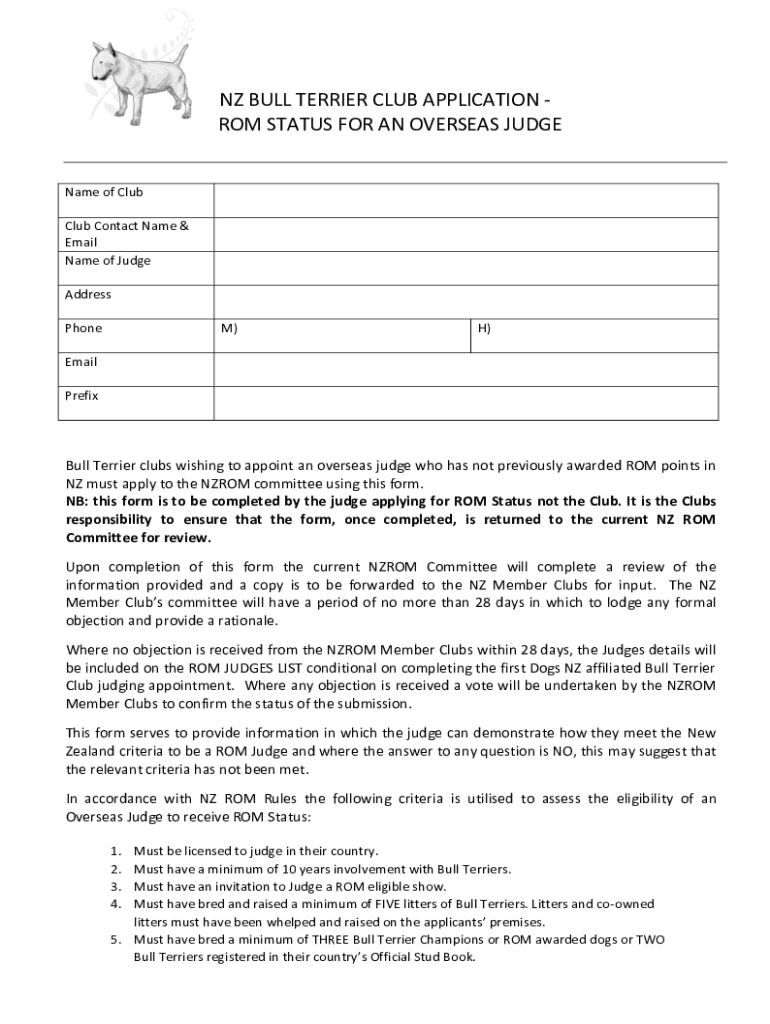 NZ BULL TERRIER CLUB APPLICATION ROM STATUS FOR AN OVERSEAS JUDGEName of Club Club Contact Name & Email Name of Judge Address PhoneM)H)Email PrefixBull Terrier clubs wishing to appoint an overseas