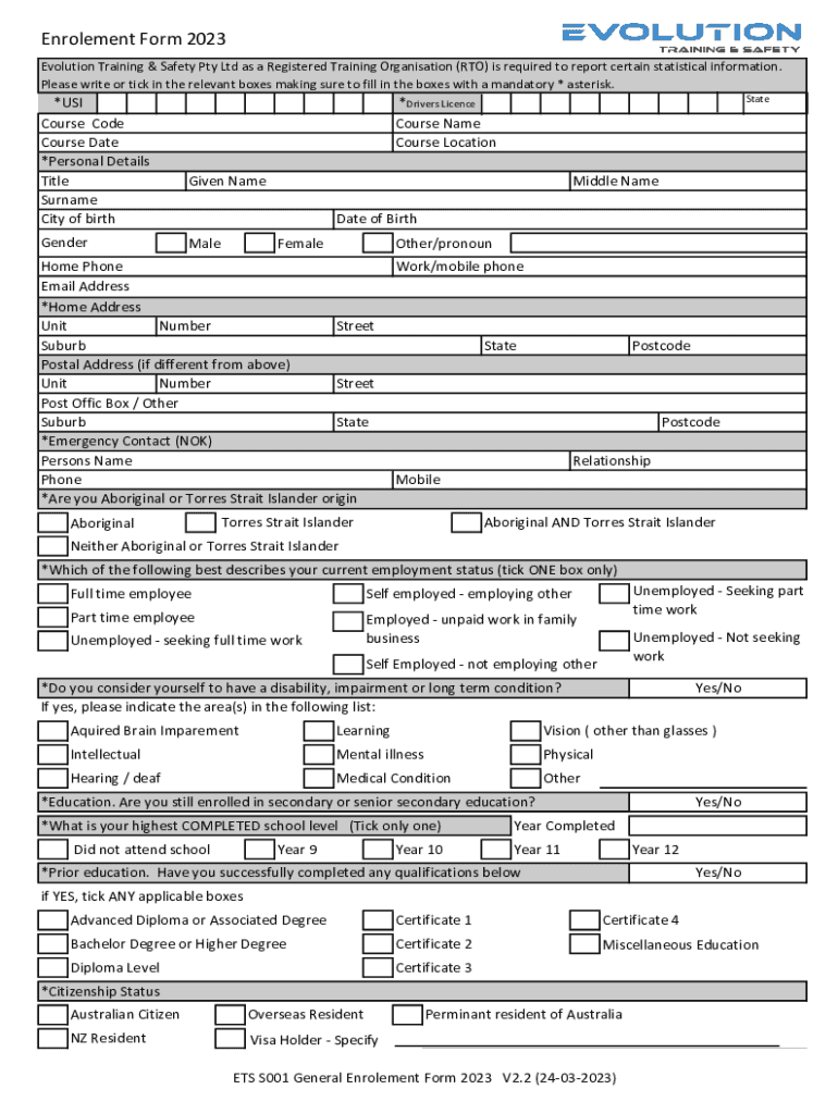 Enrolement Form 2023 Evolution Training & Safety Pty Ltd as a Registered Training Organisation (RTO) is required to report certain statistical information. Please write or tick in the relevant boxes