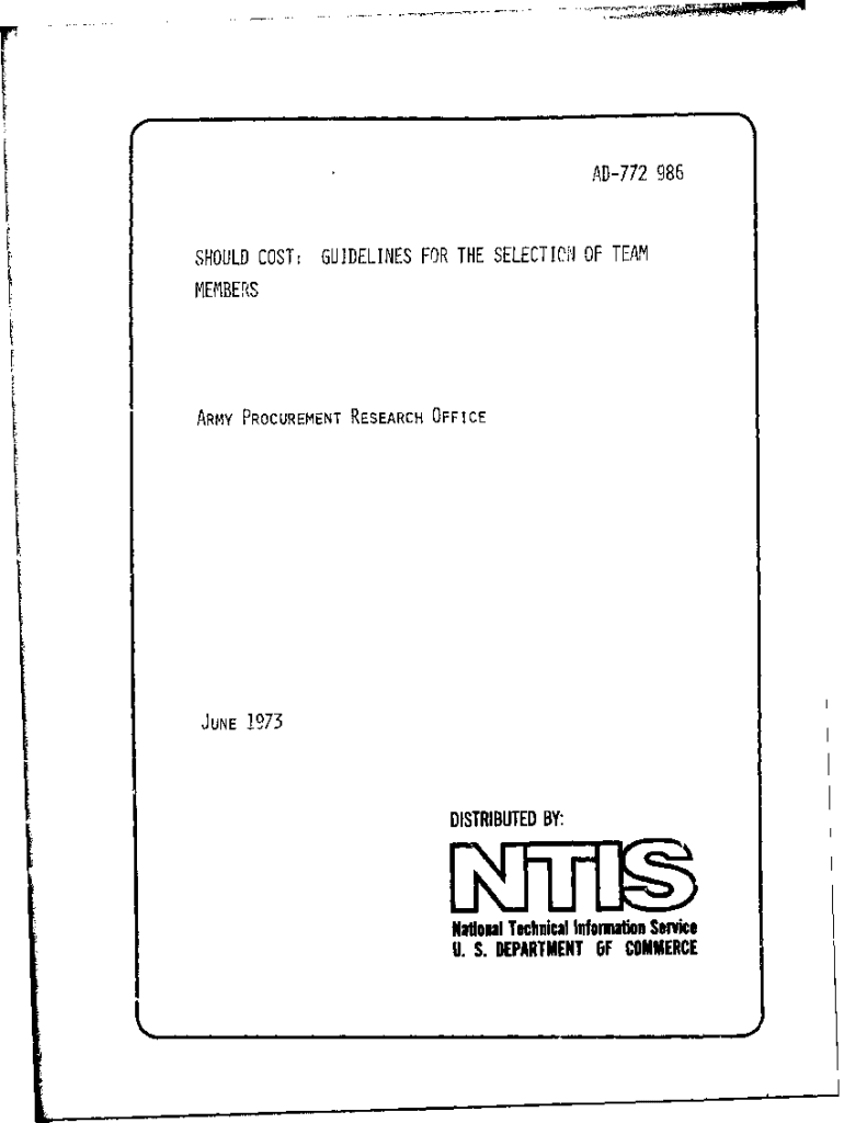 AD772 986SHOULD COST: MEMBERSGUIDELINES FOR THE SELECTION OF TEAMARMY PROCUREMENT RESEARCH OFFICEJUNE1973DISTRIBUTED BY:National Technical Infor*ation Service U.S. DEPARTMENT 6F COMMERCEUncl ass ifiedSe\'cunty