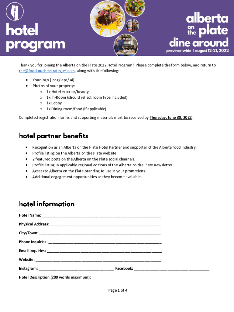 Thank you for joining the Alberta on the Plate 2022 Hotel Program! Please complete the form below, and return to rhe@foodtourismstrategies.com, along with the following: Your logo (.png/.eps/.ai)