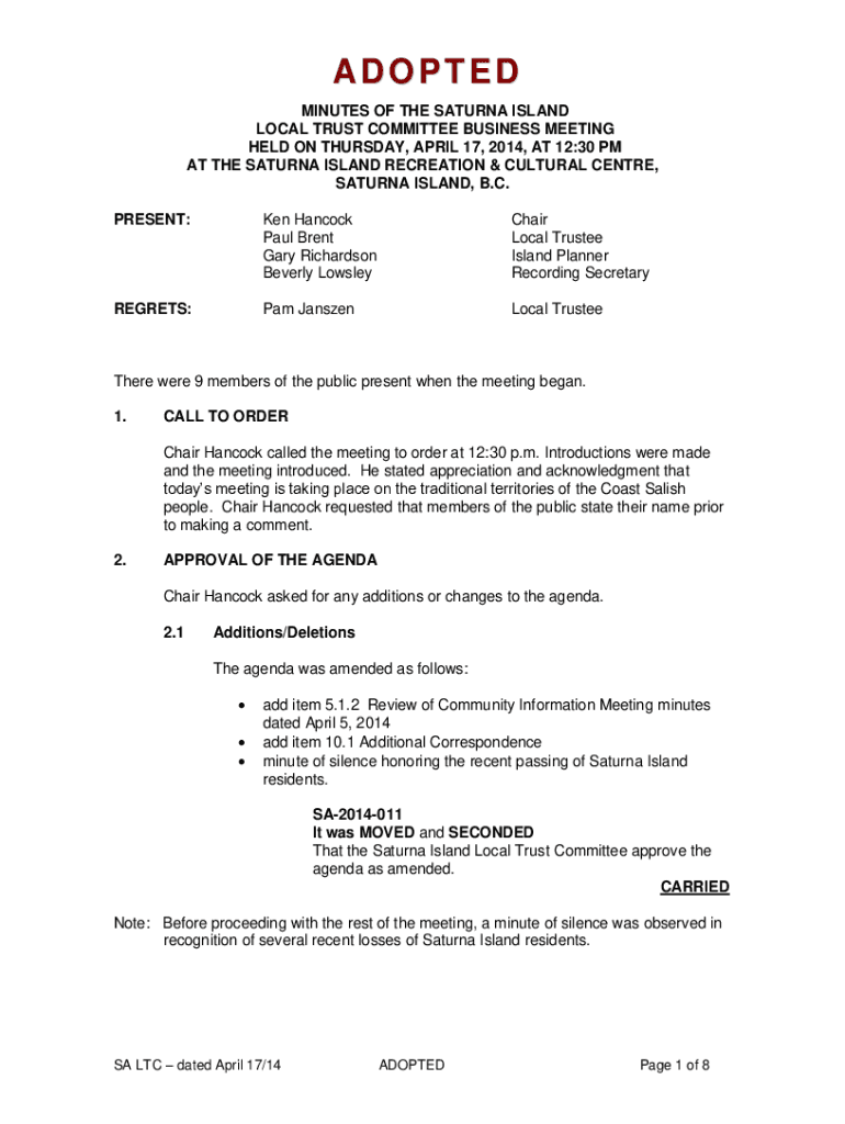 ADOPTED MINUTES OF THE SATURNA ISLAND LOCAL TRUST COMMITTEE BUSINESS MEETING HELD ON THURSDAY, APRIL 17, 2014, AT 12:30 PM AT THE SATURNA ISLAND RECREATION & CULTURAL CENTRE, SATURNA ISLAND, B.C.