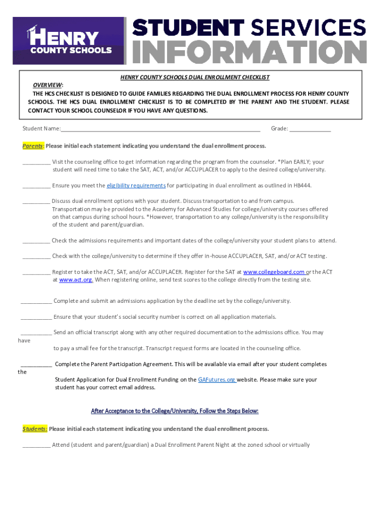 HENRY COUNTY SCHOOLS DUAL ENROLLMENT CHECKLIST OVERVIEW: THE HCS CHECKLIST IS DESIGNED TO GUIDE FAMILIES REGARDING THE DUAL ENROLLMENT PROCESS FOR HENRY COUNTY SCHOOLS. THE HCS DUAL ENROLLMENT CHECKLIST