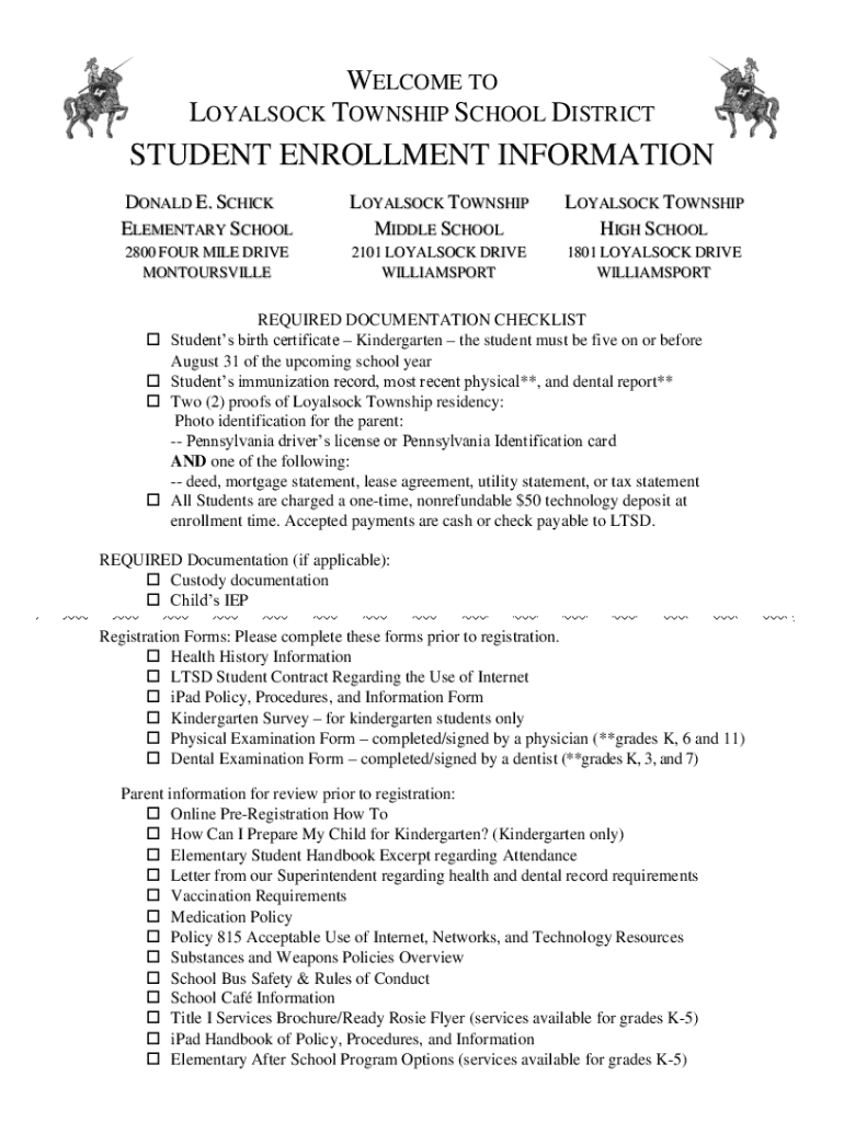 WELCOME TO LOYALSOCK TOWNSHIP SCHOOL DISTRICTSTUDENT ENROLLMENT INFORMATION DONALD E. SCHICK ELEMENTARY SCHOOLLOYALSOCK TOWNSHIP MIDDLE SCHOOLLOYALSOCK TOWNSHIP HIGH SCHOOL2800 FOUR MILE DRIVE MONTOURSVILLE2101