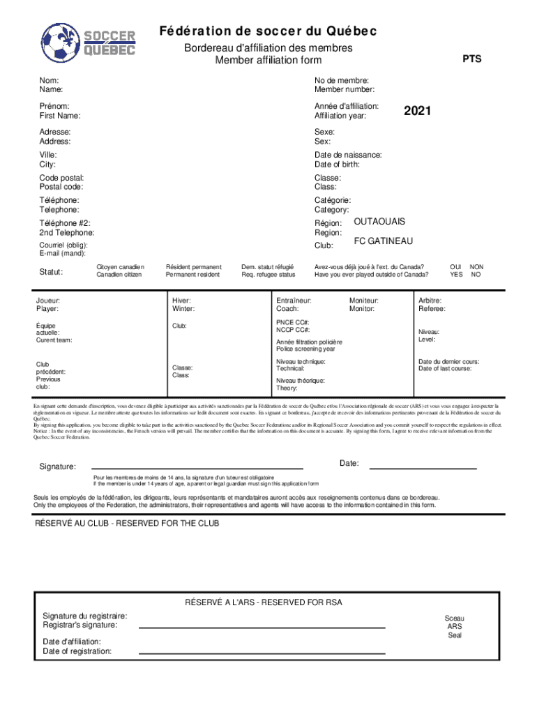Fdration de soccer du Qubec Bordereau d\'affiliation des membres Member affiliation formPTSNom: Name:No de membre: Member number:Prnom: First Name:Anne d\'affiliation: Affiliation year:Adresse: Address:Sexe: