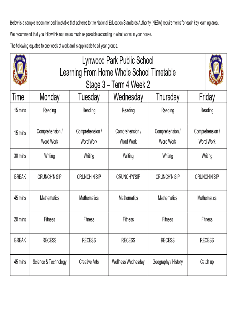 Below is a sample recommended timetable that adheres to the National Education Standards Authority (NASA) requirements for each key learning area. We recommend that you follow this routine as much