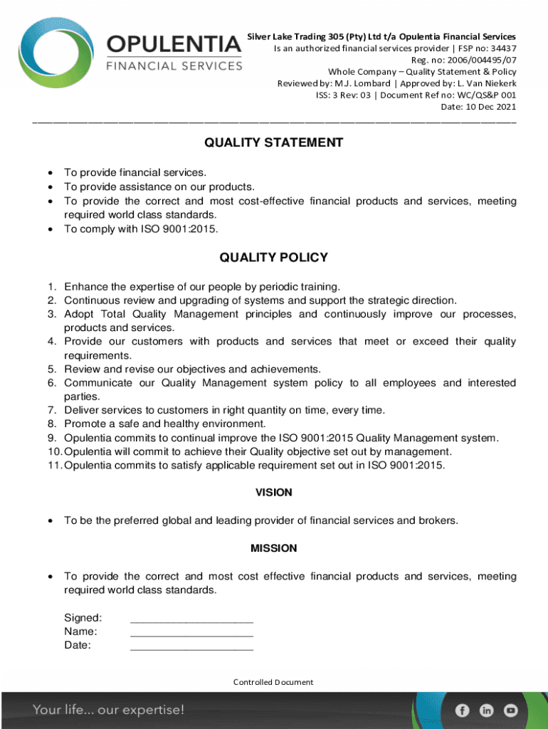 Silver Lake Trading 305 (Pty) Ltd t/an Opulent Financial Services Is an authorized financial services provider | FSP no: 34437 Reg. No: 2006/004495/07 Whole Company Quality Statement & Policy Reviewed