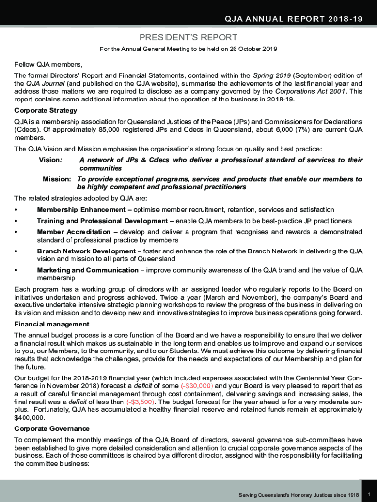 CJA ANNUAL REPORT 201819PRESIDENTS REPORT For the Annual General Meeting to be held on 26 October 2019Fellow CJA members, The formal Directors Report and Financial Statements, contained within the