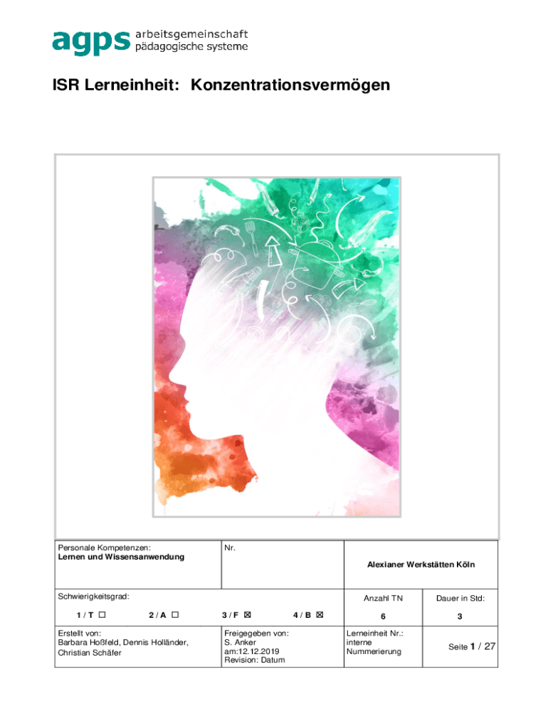ISR Lerneinheit: KonzentrationsvermgenAlexianer Werksttten KlnPersonale Kompetenzen: Lernen und WissensanwendungNr. Alexianer Werksttten KlnSchwierigkeitsgrad: 1/T 2/A Erstellt von: Barbara Hofeld,