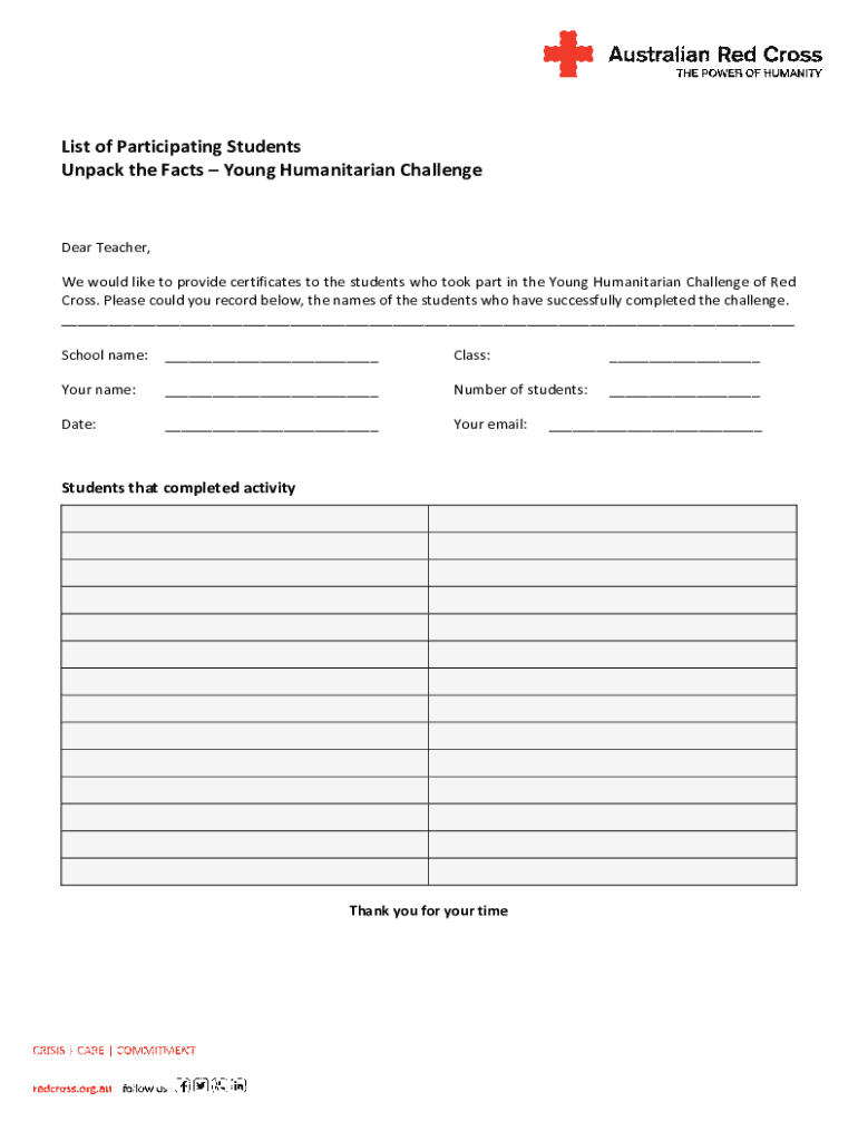 List of Participating Students Unpack the Facts Young Humanitarian ChallengeDear Teacher, We would like to provide certificates to the students who took part in the Young Humanitarian Challenge of