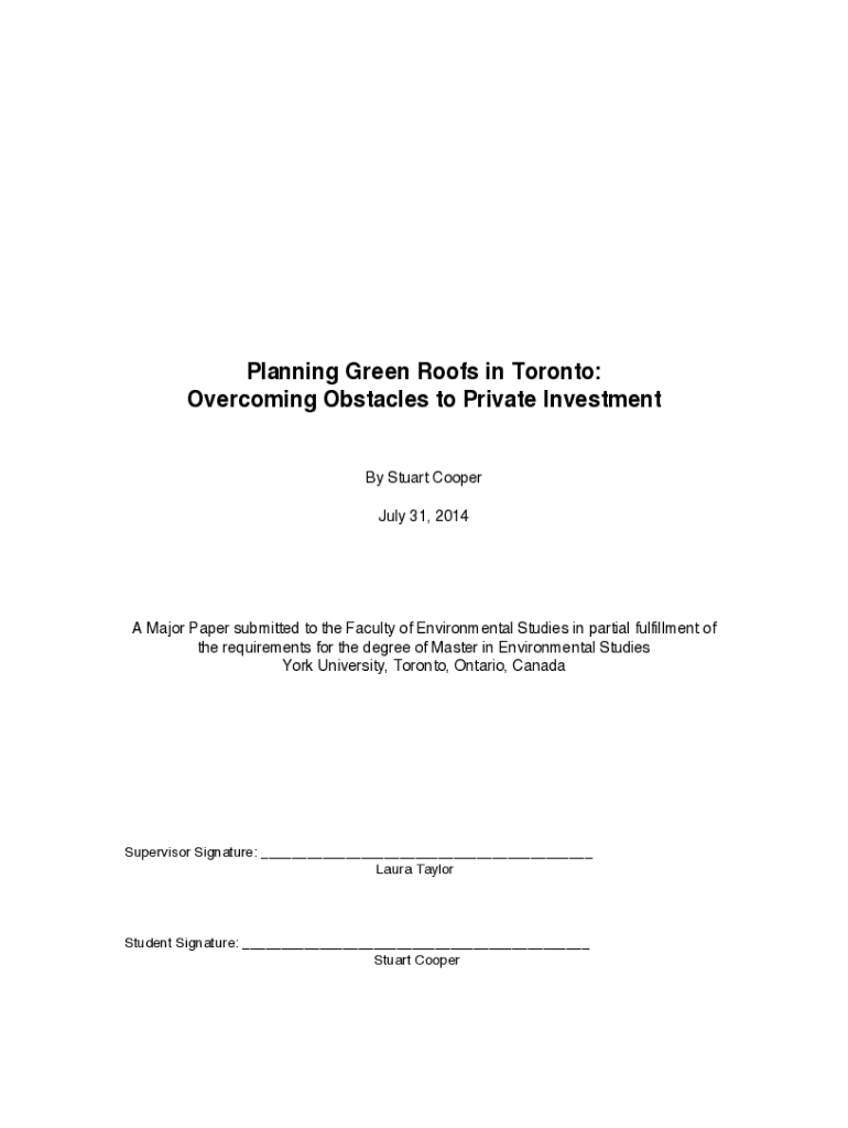 Planning Green Roofs in Toronto: Overcoming Obstacles to Private InvestmentBy Stuart Cooper July 31, 2014A Major Paper submitted to the Faculty of Environmental Studies in partial fulfillment of the