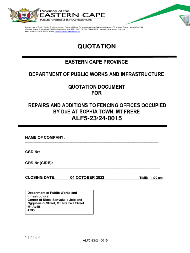 Department of Public Works & Infrastructure Corner of Nkosi Senyukele Jojo and Ngqubusini Street, Off Ntsizwa Street Mt Ayliff 4735 Eastern Cape Private Bag X3556 Kokstad 4700 REPUBLIC OF SOUTH AFRICA