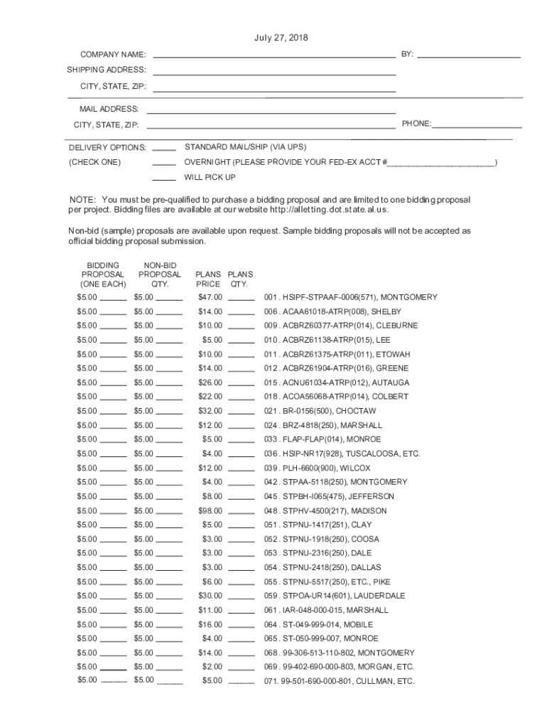 July 27, 2018 BY:COMPANY NAME: SHIPPING ADDRESS: CITY, STATE, ZIP: MAIL ADDRESS:PHONE:CITY, STATE, ZIP: DELIVERY OPTIONS:STANDARD MAIL/SHIP (VIA UPS)(CHECK ONE)OVERNIGHT (PLEASE PROVIDE YOUR FEDEX
