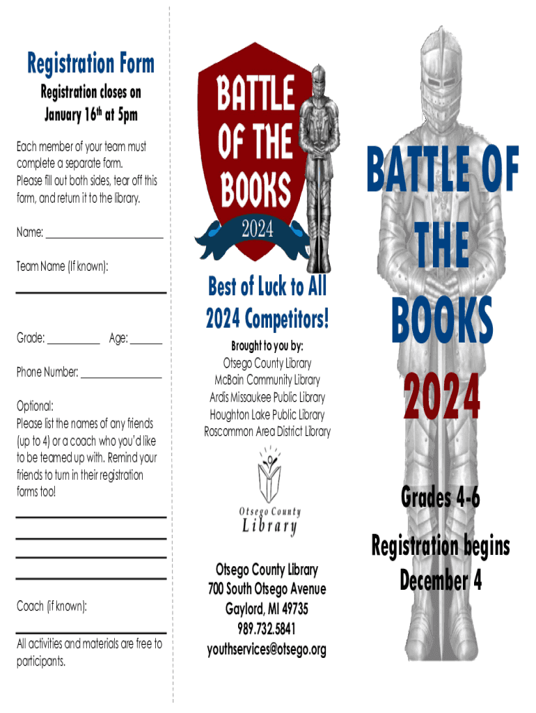 Registration Form Registration closes on January 16th at 5pm Each member of your team must complete a separate form. Please fill out both sides, tear off this form, and return it to the library. Name: