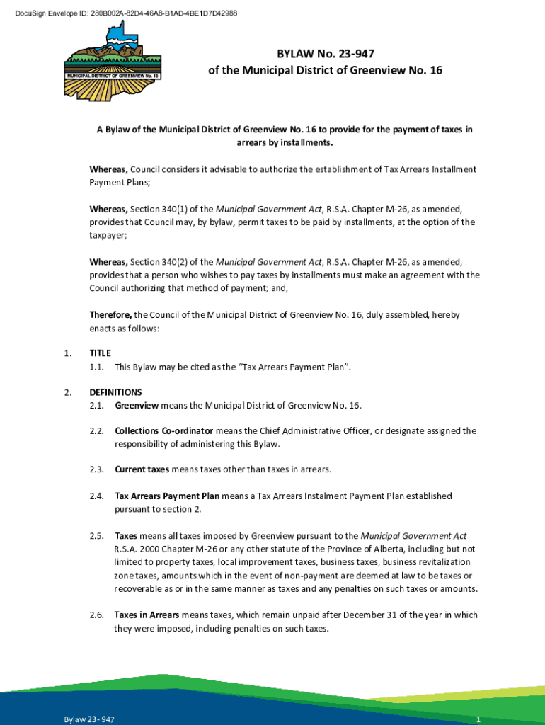 DocuSign Envelope ID: 280B002A82D446A8B1AD4BE1D7D42988BYLAW No. 23947 of the Municipal District of Greenview No. 16A Bylaw of the Municipal District of Greenview No. 16 to provide for the payment