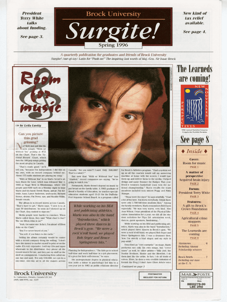 President Terry White talks about funding.New kind of tax relief available. See page 4.See page 3.Spring 1996 A quarterly publication for graduates and friends of Brock University Surgite! /surgitay/