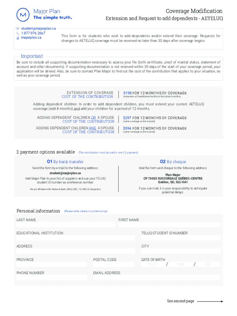 Coverage Modification Extension and Request to add dependents AETELUQ student@majorplan.ca 1 877 976 2567 majorplan.caThis form is for students who wish to add dependents and/or extend their coverage.