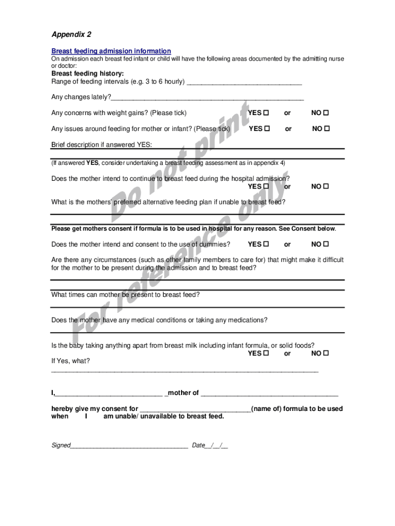 Appendix 2 Breastfeeding admission information On admission each breastfed infant or child will have the following areas documented by the admitting nurse or doctor:Breastfeeding history: Range of