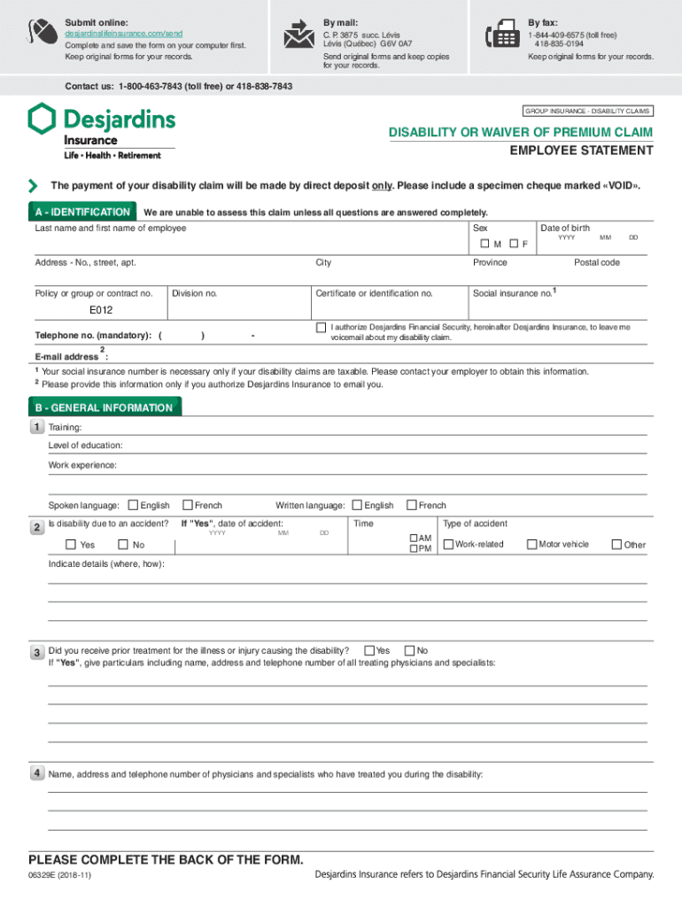 Submit online:By mail:By fax:desjardinslifeinsurance.com/sendC. P. 3875 such. Lvis (Quebec) G6V 0A718444096575 (toll-free)4188350194Send original forms and keep copies