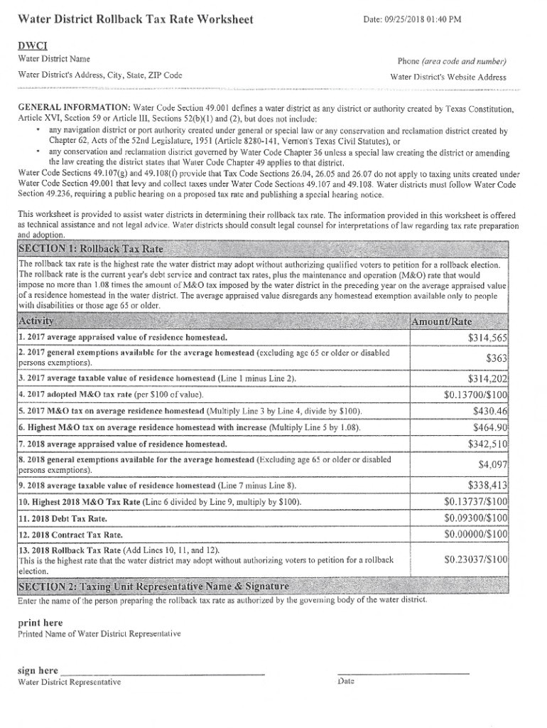Water District Rollback Tax Rate WorksheetDate: 09/25/2018 01:40 PCI