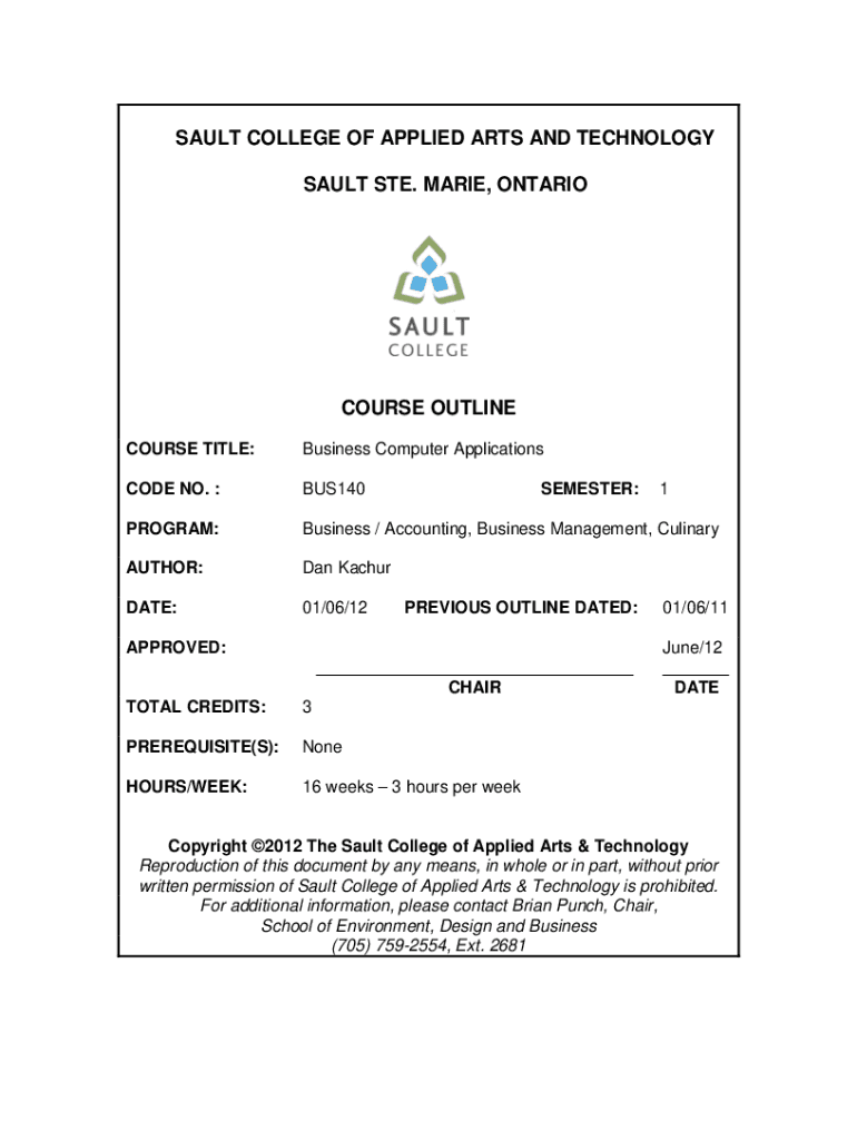 SAULT COLLEGE OF APPLIED ARTS AND TECHNOLOGY SAULT STE. MARIE, ONTARIOCOURSE OUTLINE COURSE TITLE:Business Computer ApplicationsCODE NO. :BUS140PROGRAM:Business / Accounting, Business Management,