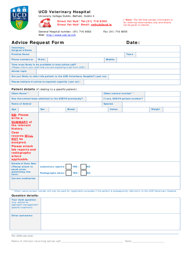 UCD Veterinary Hospital University College Dublin, Belfield, Dublin 4 Direct Vet Hub* Tel (01) 716 6200 Direct Vet Hub* Email: vethub@ucd.ie General Hospital number: (01) 716 6002 Web: http://www.ucd.ie/uvh(*Note: