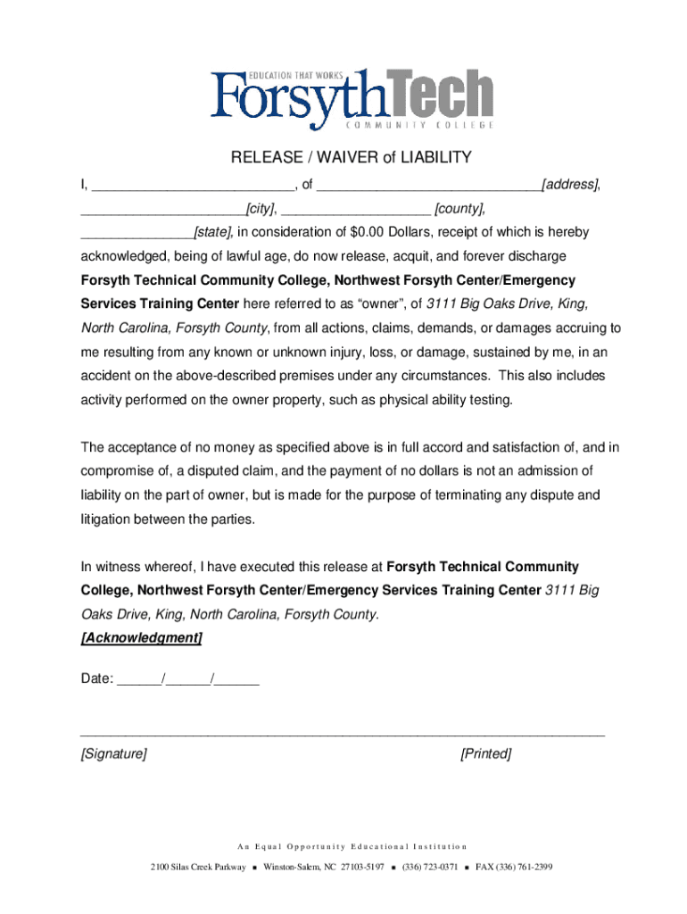 RELEASE / WAIVER of LIABILITY I, ___, of ___[address], ___[city], ___ [county], ___[state], in consideration of $0.00 Dollars, receipt of which is hereby acknowledged, being of lawful age, do now