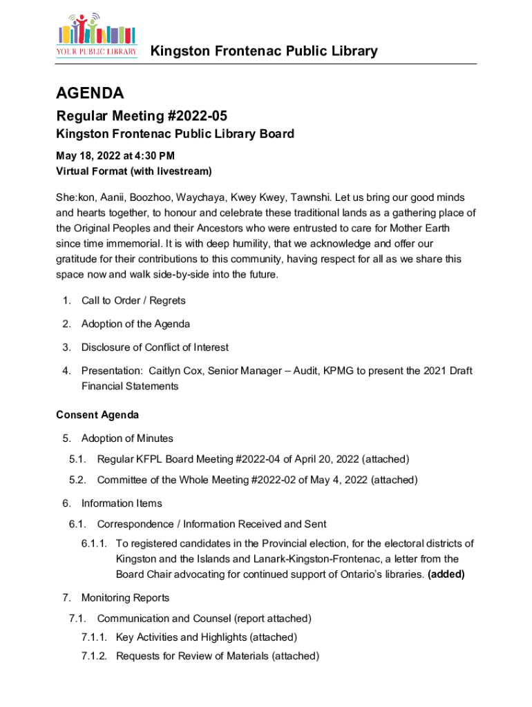 Get the free 2022-05 May 18, 2022 Library Board Agenda Package, with addeds