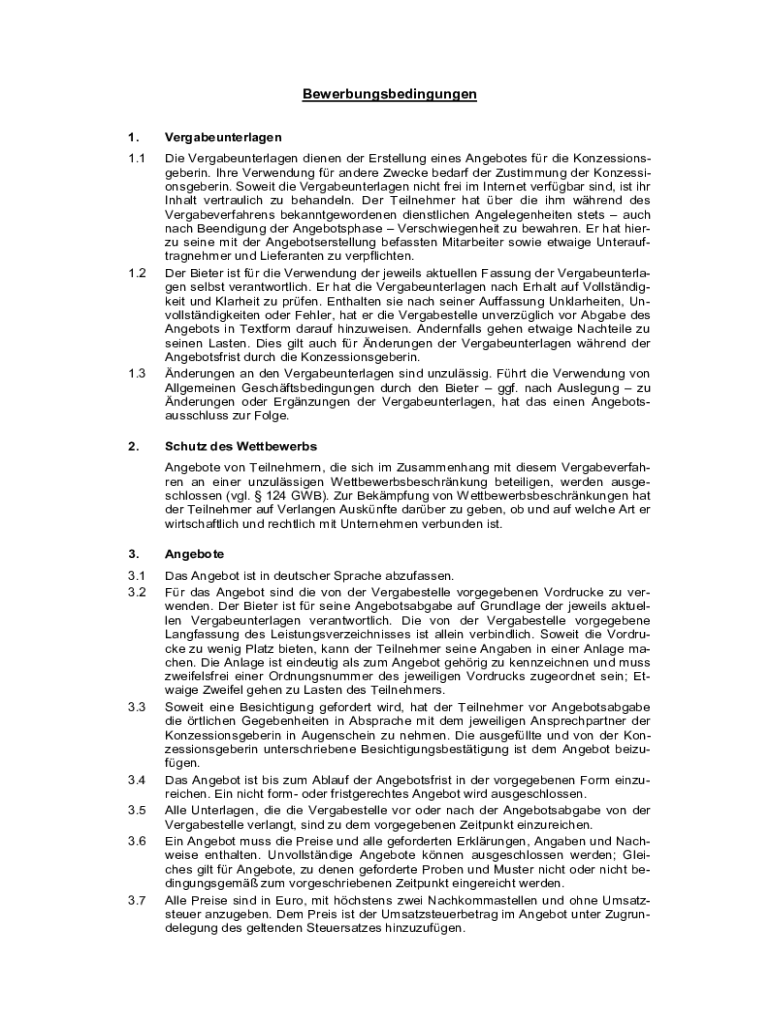 Bewerbungsbedingungen 1.Vergabeunterlagen1.1Die Vergabeunterlagen dienen der Erstellung eines Angebotes fr die Konzessionsgeberin. Ihre Verwendung fr andere Zwecke bedarf der Zustimmung der Konzessionsgeberin.