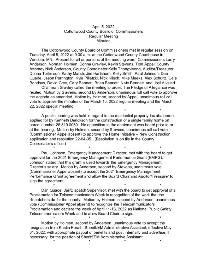 Get the free April 5, 2022 Cottonwood County Board of Commissioners ...