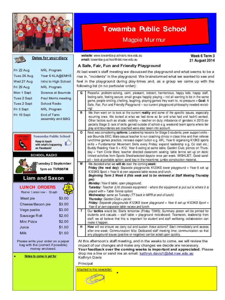 Towamba Public School Magpie Murmur 1981 Towamba Age championsDates for your diarywebsite: www.towambap.schools.nsw.edu.au email: towambap.school@det.nsw.edu.auWeek 6 Term 3 21 August 2014A Safe,