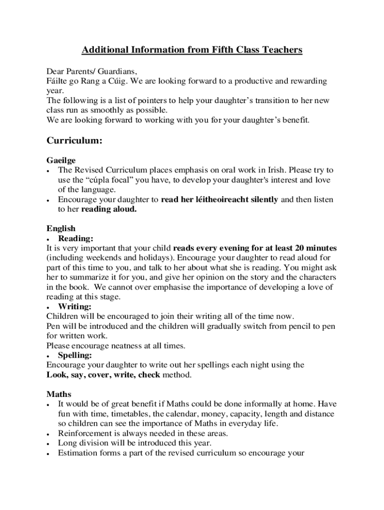 Additional Information from Fifth Class Teachers Dear Parents/ Guardians, Filte go Rang a Cig. We are looking forward to a productive and rewarding year. The following is a list of pointers to help