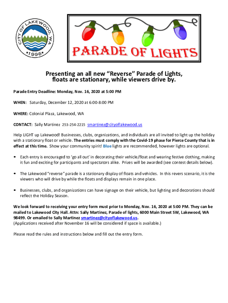 Presenting an all new Reverse Parade of Lights, floats are stationary, while viewers drive by. Parade Entry Deadline: Monday, Nov. 16, 2020 at 5:00 PM WHEN: Saturday, December 12, 2020 at 6:008:00
