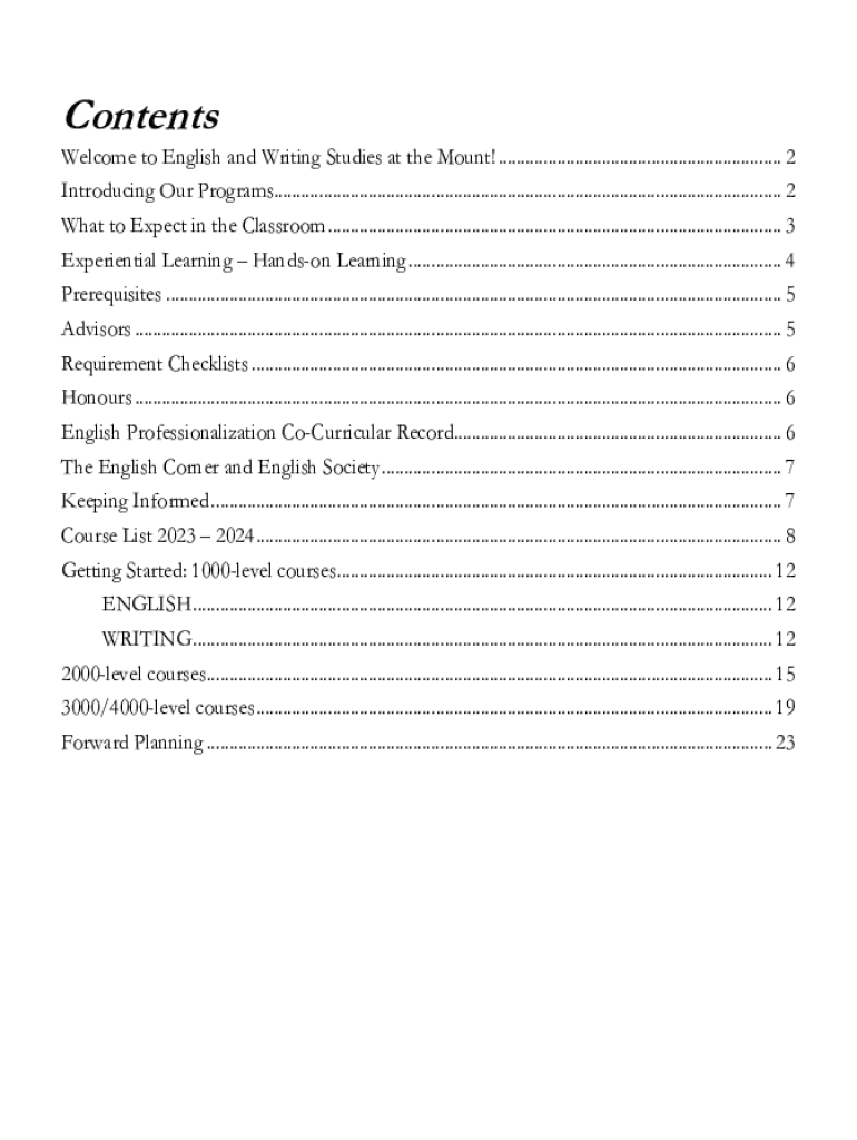 Contents Welcome to English and Writing Studies at the Mount! ............................................................... 2 Introducing Our Programs.................................................................................................................