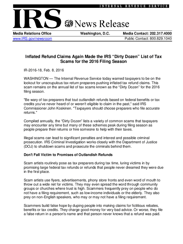 Media Relations Office www.IRS.gov/newsroomWashington, D.C.Media Contact: 202.317.4000 Public Contact: 800.829.1040Inflated Refund Claims Again Made the IRS Dirty Dozen List of Tax Scams for the 2016